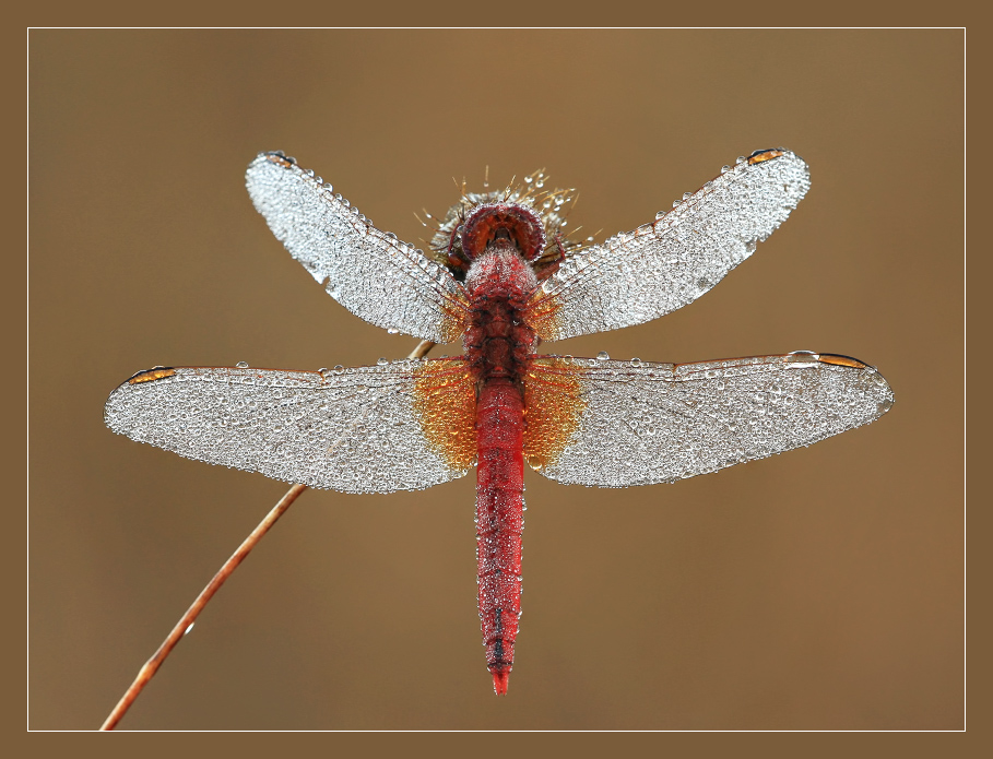 И прийти на нее с рассветом(или даже немного раньше). Увидеть стрекозу покрытую росой намного проще, они так блестят, что за 10 метров видны, а вот без росы и с метра сложно разглядеть.