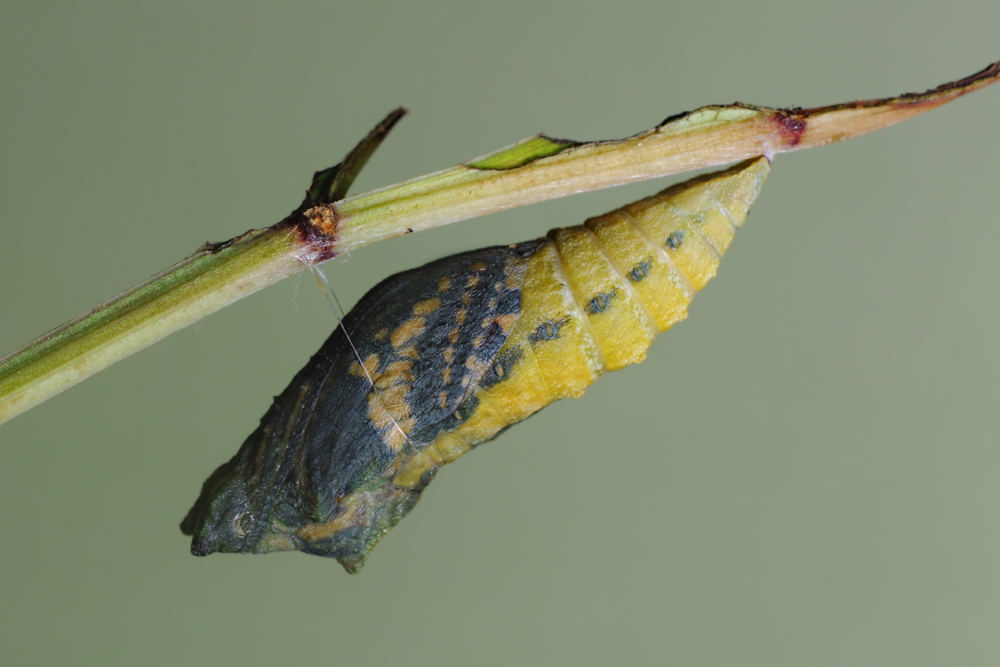 Спасибо! Сергей, будьте крайне внимательны. Вот когда у куколки станет виден чёрный узор крыльев, как на данном фото, то тут уж надо дежурить. По моим наблюдениям бабочка выходит рано утром. Т.е. , после почернения надо подготовить аппаратуру, фон и т.д и сидеть рядом не смыкая глаз. Судя по описаниям процесс выхода очень недолог, несколько минут. Стадия обсушки и расправления крыльев длится уже подольше, но ведь самое интересное - застать момент выхода. У меня в этом году вышли два махаона, и оба момента я прозевал... Удачи!