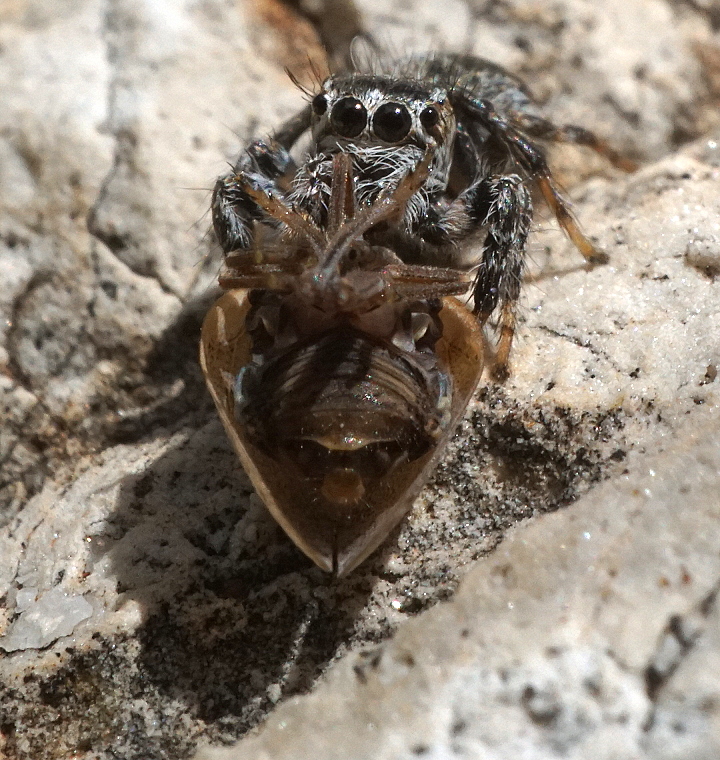 Ямка, в виде воронки, выкапывается личинкой муравьиного льва. Я, честно говоря, не знаю, как это происходит. Может в процессе выкапывания скакун напал на личинку. Может они муравья не поделили, ведь этот скакун также успешно ловит муравьёв. Может личинка напала на скакуна, но что-то пошло не так.... Можно строить массу разных гипотез. Но факт остаётся фактом - не лев жрёт паука, а паук -льва.