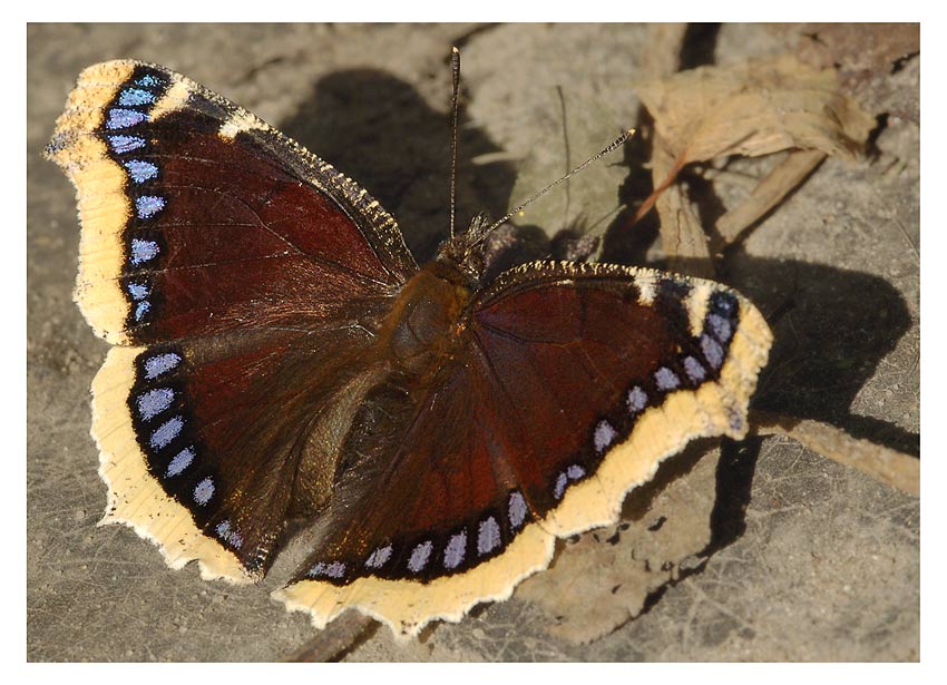 Тоже всё мечтаю их поснимать. В нашем Токсове (Ленобласть) периодически массово появляются, но в последние пару лет не попадались (думаю, что просто не вовремя). А вот в прошлом году увидел свежайшую(!) траурницу в Таврическом саду, вызывающе-красиво сидящую у корней дерева на очень фотогеничной грубо-морщинистой трещиноватой тёмной коре! И свет был натуральный и изумительный просто: раннего, слегка дымчатого солнечного утра! Как у "ненастоящего фотографа", камеры с собой не было...  Долго глядел-любовался, но потом, однако, решил попытать счастья (дерево далеко от тропинок было) и понёсся за камерой домой (благо недалеко обитаю)!  Есессно, когда вернулся минут через 10, её там уже не было...  Около часа ещё бродил, надеясь на случайную встречу, но увы...