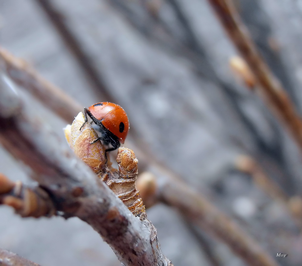 А по снимку- ну весна ведь, вот коровка и занята своими делами! Конечно занята, весна на дворе, работы непочатый край  коровка очень торопилась