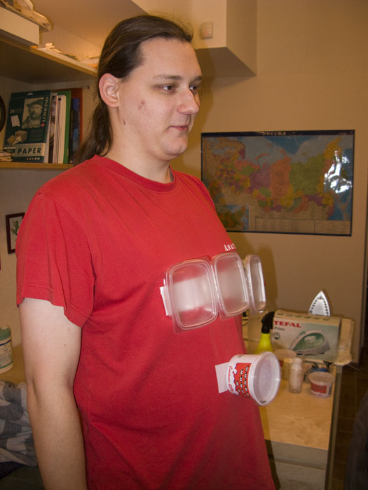 Хотя и так прокатило и меня ни разу не остановили  Пришёл к такой конструкции, т.к. любые внутренние карманы находятся как минимум уже после слоя свитеров, далее осталось сочинить крепление - двухсторонний скотч справился на 100%. Получается и руки свободны и "инсекты" в тепле