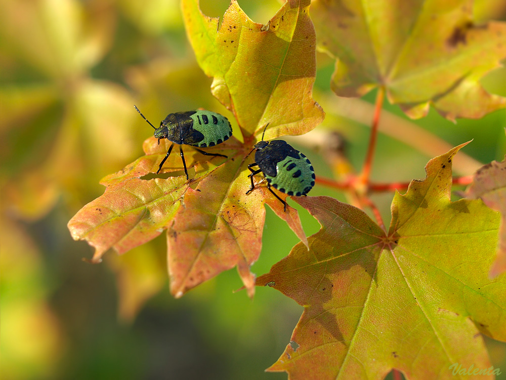 Зелёная (в прямом и переносном смысле) молодь клопов на красивых осенних листьях,да ещё при мягком солнечном свете - здорово  !