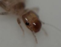 Спасибо за подсказку! Сегодня снова видел-уже двоих, "зверьков" - один был бескрылый. Попробовал его поснимать. Подумал, что он cуетится в поисках воды. Капнул водой возле него и случайно его залил. Думал-ну всё! Утонул, погиб ...  На всякий случай собрал бумажной салфеткой воду вокруг него. Глянул через пару минут-а он живой! Ползает себе, только медленнее, чем раньше, быть может, осторожничая, после вынужденного купания. Ну, я и воспользовался моментом. Собрал систему из переходника RMS, макроколец и 5-кратного микрообьектива. Вот одно из фото в большом увеличении. На нём видно, что глаза у него, похоже, простые (я немного утрировал, обработав блики на глазу там, где они уже были). А на Вашем фото глаза больше похожи на фасетки.  Надо будет ещё поснимать-проверить ...