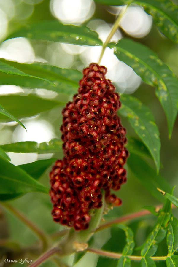 А где у него рога? "Большие перисто-сложные листья уксусного дерева увенчивают многочисленные сильные горизонтальные побеги, отличительная особенность которых – сильно опушенная поверхность, делающая ветви похожими на оленьи панты. Отсюда и пошло видовое название «оленерогий»" (из интернета)