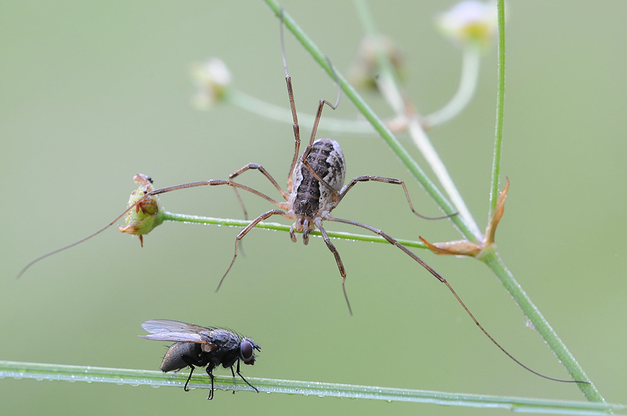У тебя ответ в твоем вопросе-угол наклона( про грип). Про травинку : кончик оборван и помят видимо, лежит кончиком на стволе растения. Паук не двигался какое то время, просто поза удачная получилась. Утро, оба не сильно активные , муха села и не особо реагировала на мою возню вокруг дивана  дала сделать два кадра и ретировалась (мухи как и кошки гуляют сами по себе  ).