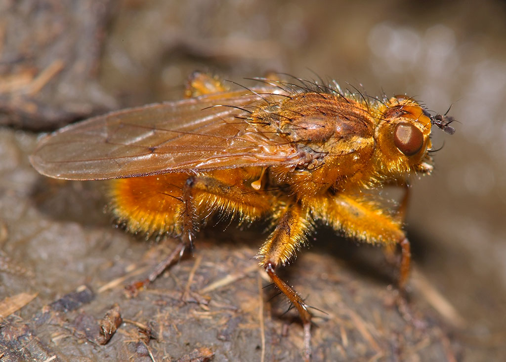 Вообще-то, кто-то из родственников серой мясной мухи (Sarcophagidae), но вот что у неё на морде, я не знаю...