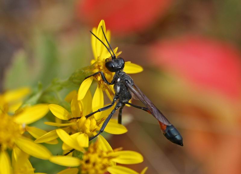 Аммофила (Ammophila sp., сем. Sphecidae) тащит парализованную ею гусеницу в норку.