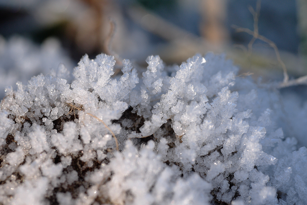 Иней на поле в 9 утра и прилежащий лес, снятый часом позже: