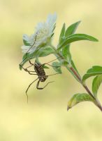 Мой попрыгал сначала, а потом успокоился. Минут десять я его фотографировал. Он только периодически надкрылья немного приподнимал. А потом всё таки улетел.