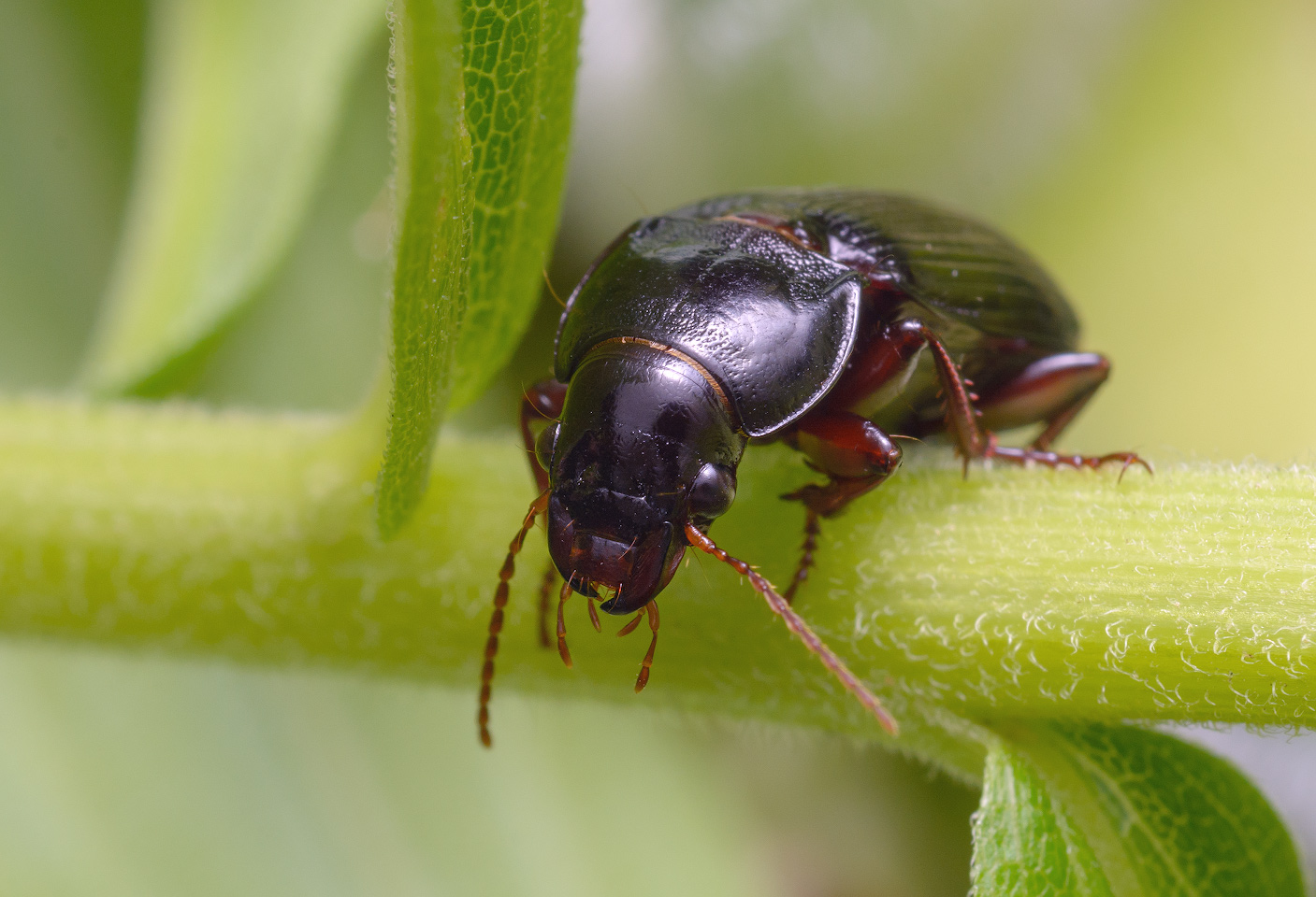 наверное Harpalus sp. хотя внешность подобная у многих родов. да вот толко едениці жужелиц таикх часто встречаются на растениях. Насколько знаю, некоторые виды Harpalus или Pseudoophonus rufipes но тут точно не она сам был удивлен. увидев ее днем на стебле. Обычно они под камнями сидят