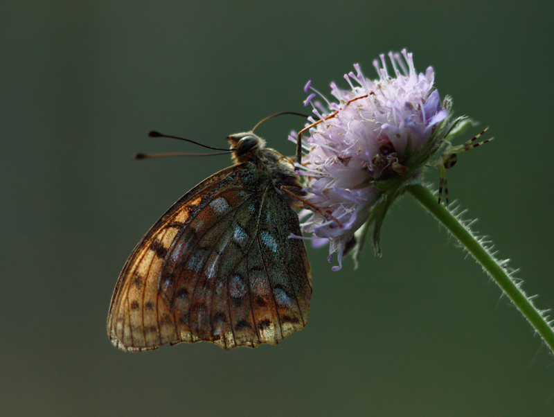 Кстати, прочитал, будто для большой перламутровки характерен следующий способ откладки яиц: самка прикрепляет одно яйцо к стволу дерева на высоте примерно полтора метра. Затем еще одно - на следующий ствол, но еще выше. Потом еще выше и так далее. Правда, данная особь, видимо, умных книжек не читала, клала яички прямо на кормовые растения, причем ненамного выше уровня почвы.