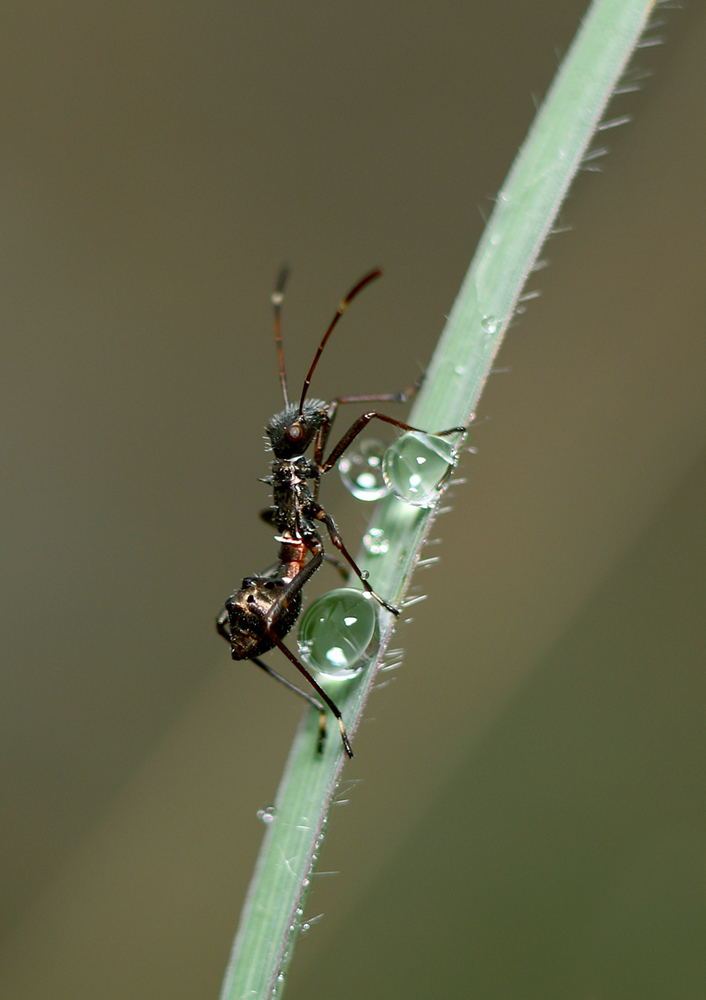 Про личинку не в курсе, вот прошлогодний. он был в два раза меньше, я его вообще снимал как муравья. только дома на компе разглядел, что это клоп. А может это и другой, хотелось бы услышать Корифеев! Может и не личинка, показались надкрылья недоразвиты. А на фото с капельками похоже другой вид. В общем нужны спецы.