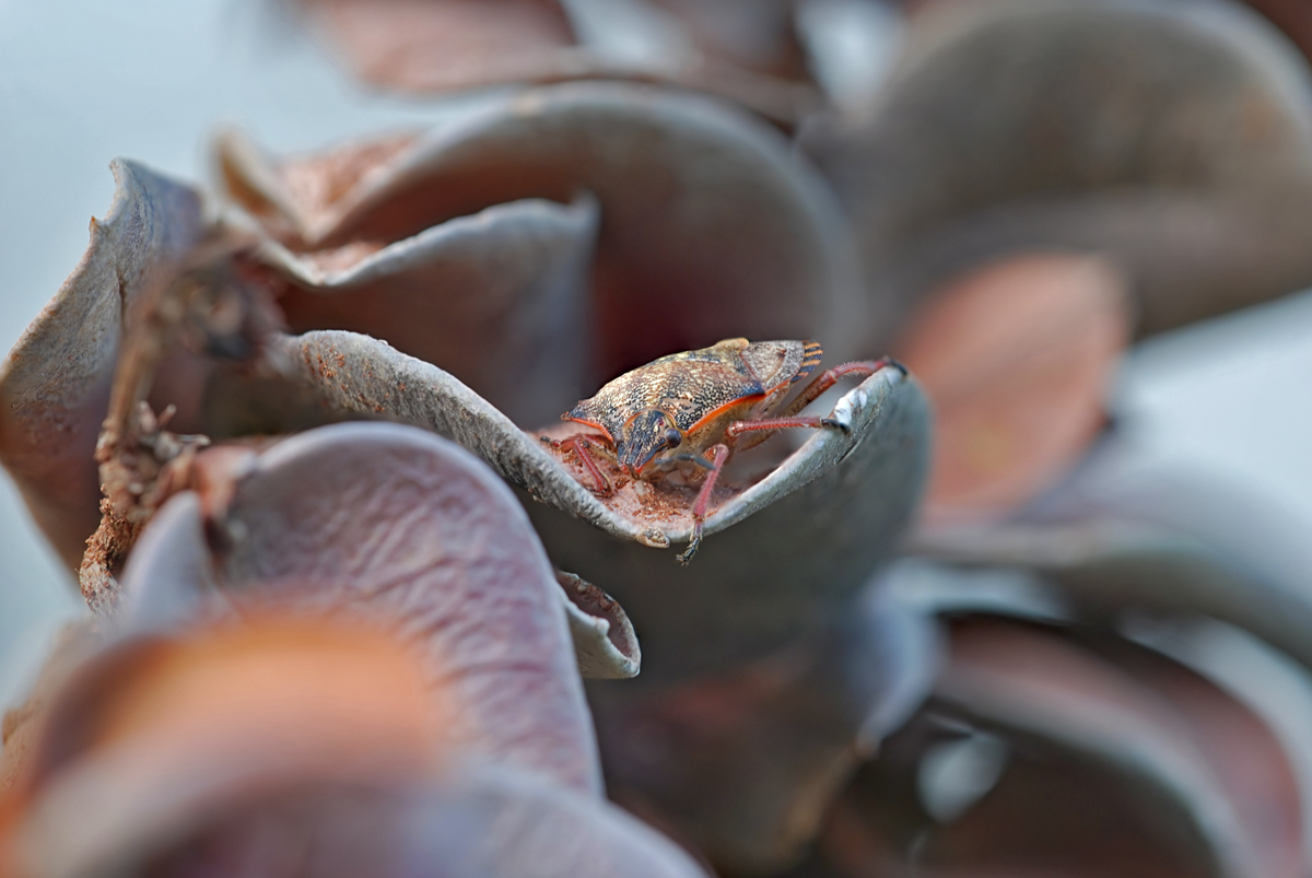 Посмотрела повнимательнее... крупные размытые объекты на переднем плане, на мой взгляд, мешают общему гармоничному восприятию работы. Хотя бы первый, с персиковым пятном объект убрал бы при съемке и работа, даже с клопиком в таком масштабе воспринималась бы лучше. Но, к сожалению, не всегда это можно просчитать, глядя на дисплей...