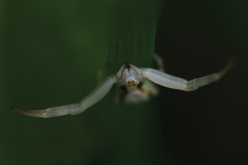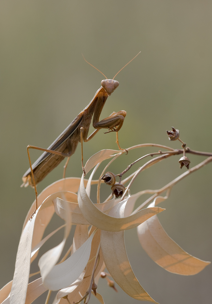Светлые листья отлично смотрятся с темными "колокольчиками". Нравится фон, кадрирование. Не совсем нравится свет. Его не хватило на животик богомола, как мне кажется..