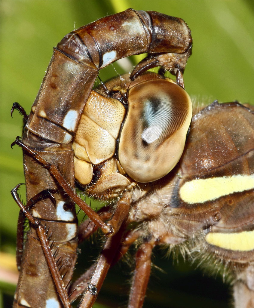 оса висела под листом именно в этом положении, зацепившись только последней парой ног и жевала то ли муху, то ли пчелу...