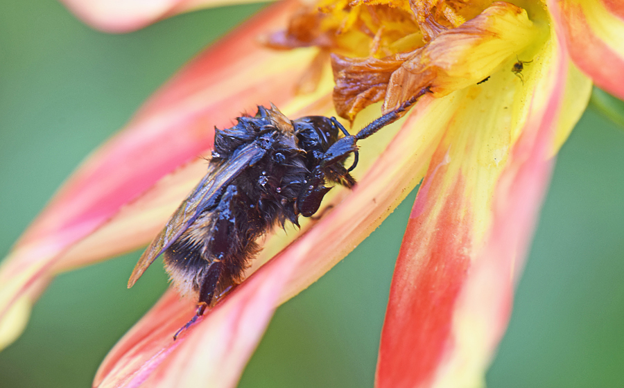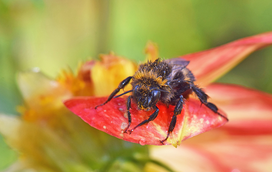 Только прошел дождь, который видимо и застал несколько этих шмелей на георгинах. Вот этот был самый мокрый и снимок не очень получился из за того что с рук снимал и ветер немного цветы раскачивал. Может этот ракурс поможет с определением, хотя шмель весь мокрый