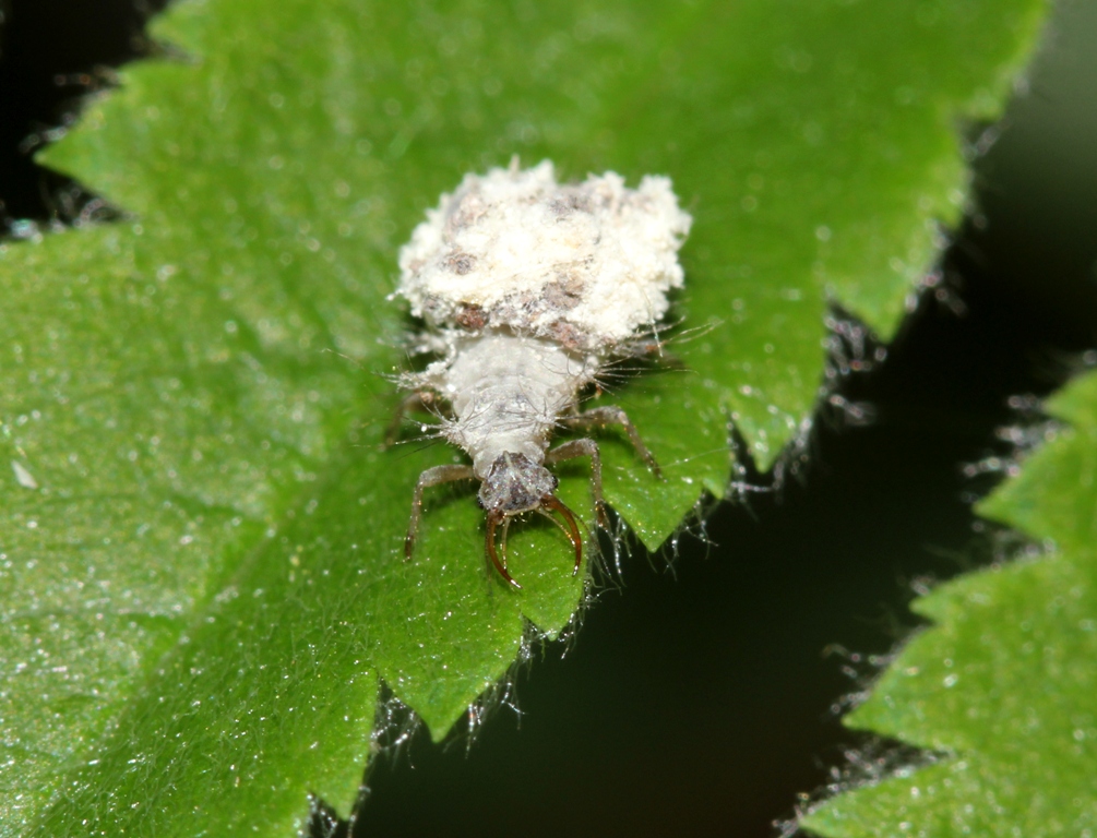 На снимке личнинка златоглазки, прикрытая высохшими шкурками съеденных ею тлей. Таким образом она и маскируется, и не перегревается.