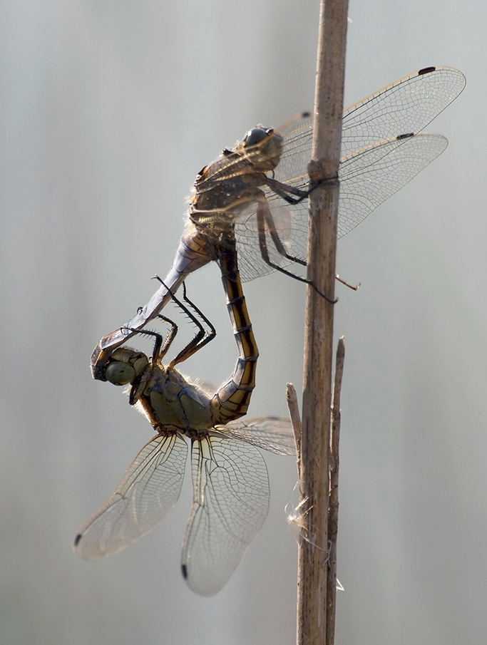 Богомол был маленький - примерно в половину от взрослого зелёного, и после линьки, рядом на тростинке висела шкурка. Так что он был именно таким, розовато-желтым. И потом, тростник - зеленый, ну насколько он может быть зелёным в августе на юге... Шумно, т.к. снимая птичек на ISO-200, увидал этого, объектив сменил, а чувствителность - забыл.