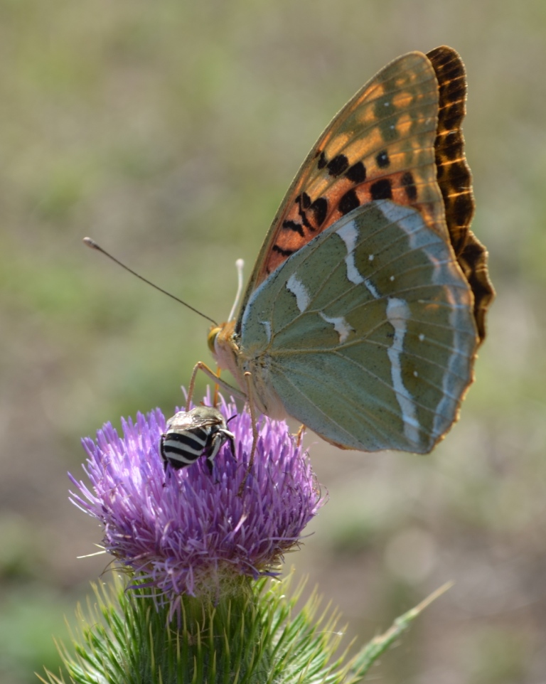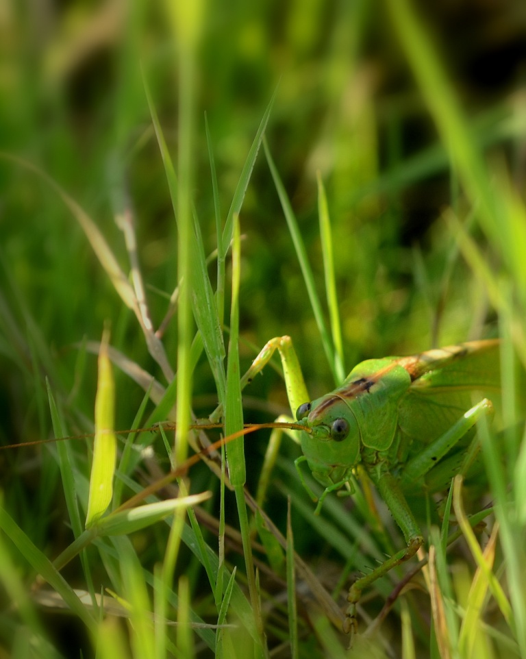 Жесткий солнечный свет, много травинок скрывающих детали, отвлекающих внимание... Зеленое на зеленом... Но тут