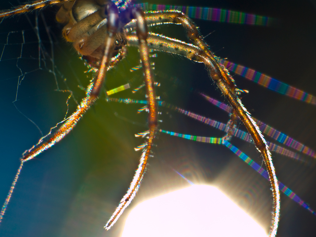 Не так много насекомых в джунглях для неопытного туриста.  Лес почти непроходим, да и на поверхостный взгляд - стерилен. Этого отыскал на опушке вокруг непролазных зарослей. Паук размером около трех милиметров. У него не разветленная сеть, но черезвычайно уловистая. Болталась в редких паутинах до 4- 5 свежих мух размером с него. Не пуглив, и когда я кончиком соломки попытался отогнать от большой мухи, которая заслоняла его самого, отошел нехотя - с боем. Тут же достал из-под листочка поменьше мушку, вылез на паутинку и занялся трапезой...