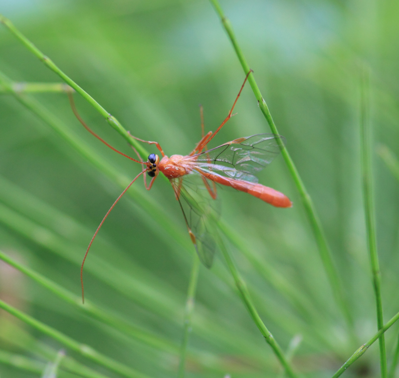 Это наездник Ophion sp. (сем. Ichneumonidae). Сдается мне, что с цветами что-то не совсем так - слишком уж насыщенно красный он получился.