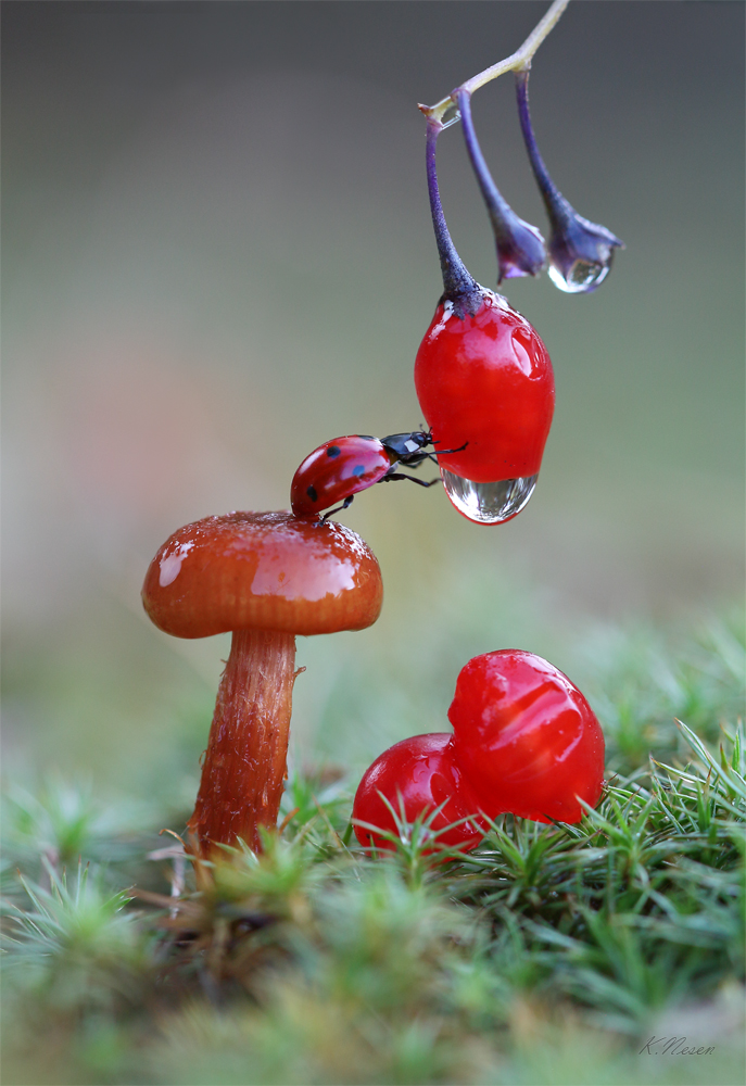 VLANN: Тоже не люблю такие голимые постановки. Коровки, конечно, могут ползать где угодно, особенно осенью, когда они собираются "баиньки". Но что коровка забыла в такую сырую погоду на сыром же грибе, судорожно по нему бегая и цепляясь за подсунутую еще более мокрую ягоду? Они в такую погоду дома сидят, телевизор смотрят, а не эквилибристикой в лужах занимаются.