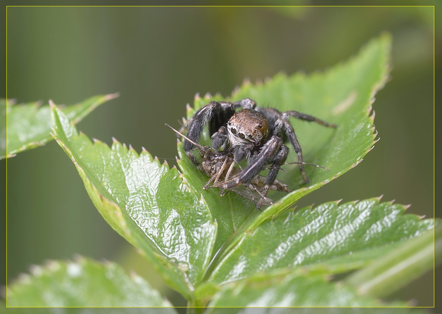 Цветовое решение интересное, а вот то, что ушедшие из зоны фокуса лапки загораживают самое интересное - лицо и глаза паучка - очень жаль!