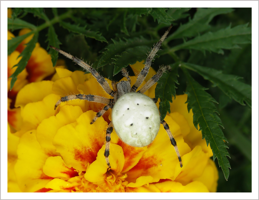 Поскольку этот паучок "прописался" на нашей даче, то я имею возможность время от времени с ним общаться. Вчера он сплет просто шикарную паутинищу на горохе, причем появились два небольших его помощника, маленьких паучком, они его большую паутину как бы укрепляют по бокам своими, это так интересно!.. Охота идет полным ходом. Жизнь голодного хищника во всей красе... ждем жертвы. Макроохота за охотой паука.
