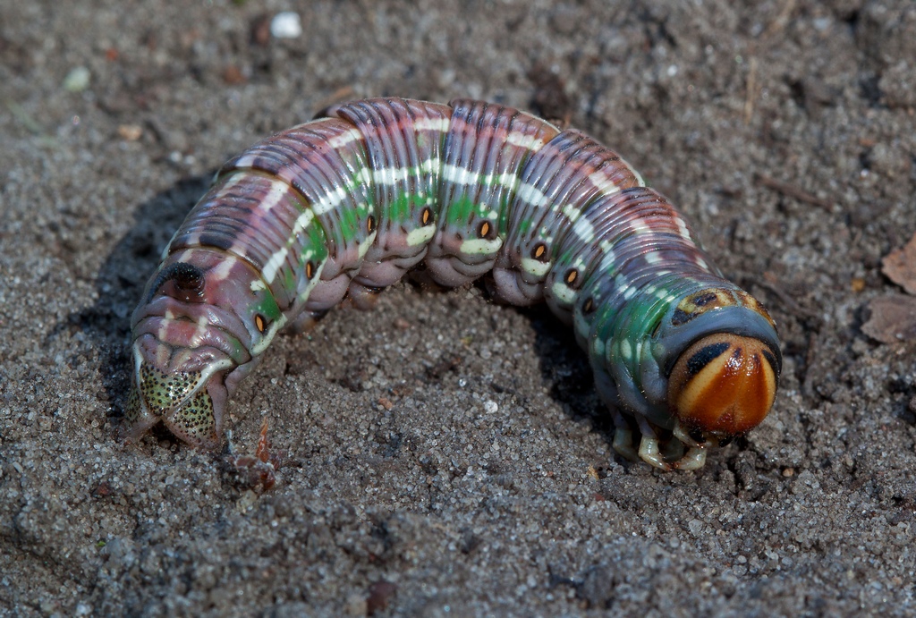 Гусеницы соснового бражника бывают двух цветовых форм - типичной (зеленая) и коричневой. Вот у последней лиловым и фиолетовым пахнет, особенно, когда гусеница собралась линять или окукливаться.