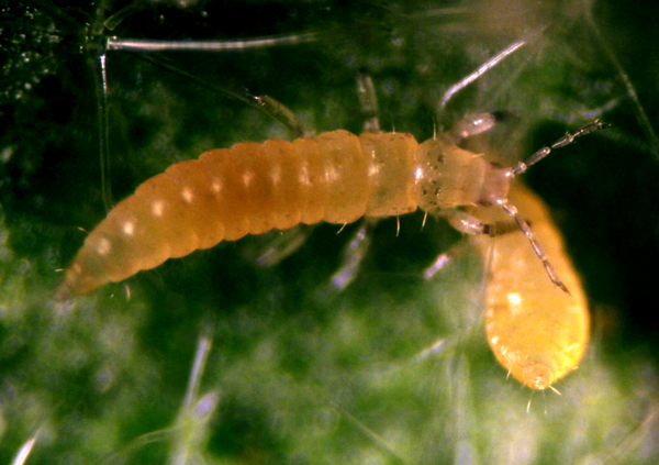 На фото личинка хищного трипса поймала личинку западного цветочного трипса и высасывает содержимое.