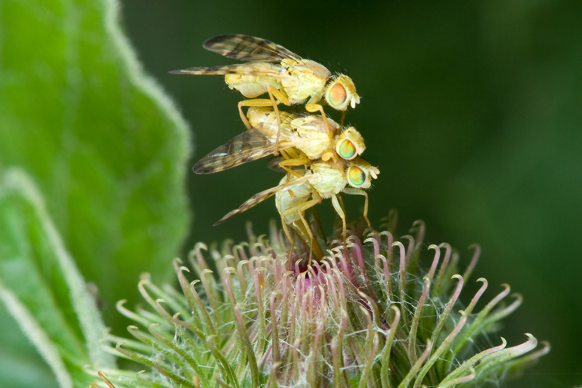 Наблюдал за этими мушками во время съемки. Они ( около 5мм длины) почему-то окупировали только небольшой кустик репейника или чертополоха и устроили в нем возню. Те, что с яйцекладом, редко бывали одни и постоянно на них сверху напрыгивал самец (тот что с обычным брюшком)