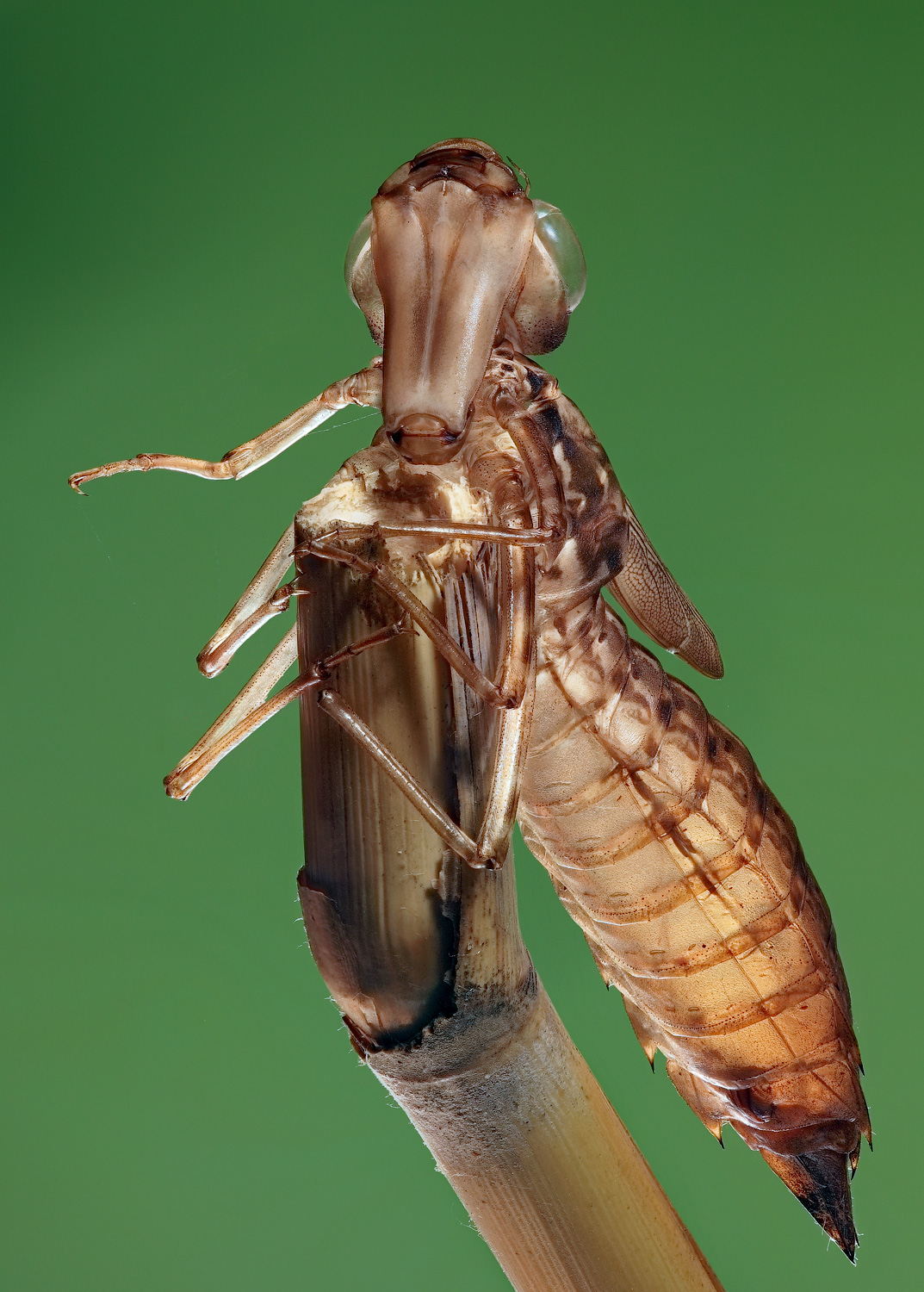 На виде сбоку (приаттаченном) сверху на спинке выше "крыльев" видна белая ниточка - вот из этого места (из загривка) как раз и вылезла стрекоза.Просто отверстие для выхода получилось очень аккуратным(на мое счастье) - обычно это огромный вырыв, как из фильма "Чужие":)
