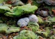 Вероятнее всего, это те же самые трутовики, чьи плодовые тела видны на фото зелеными и щетинистыми (Lenzites, Cerrena или Trametes). Такое получается, когда гнилушка с разросшимися на ней трутовиками оказывается перевернутой - после этого начинают формироваться новые плодовые тела, имеющие гименофор на противоположной (по сравнению с первоначальным положением) стороне. Именно такие молодые плодовые тела с волнистым гименовором тут и видны. Видимо, дерево в очередной раз оказалось перевернуто и они оказались сверху.