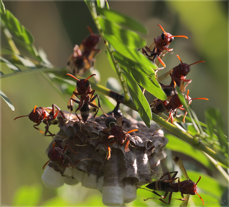 Неожиданно наткнулся на гнездо ос. Наши желтые, а тайские - красные. Дружно повернувшись в мою сторону, они сидели на гнезде приподняв передние ноги и покачивая ими из стороны в сторону. Сомнений не было - это предупреждение неприятелю, то есть - мне. Попытался зайти с другой стороны - все они повернулись в мою сторону. Подвигал ладонью сбоку - повернулись в сторону ладони, а потом опять, дружно, - в мою сторону. А потом не выдержали моего нахальства и кинулись в бой! Три укола в грудь и в плечи и неприятель бежит!