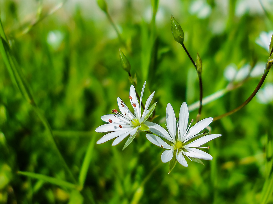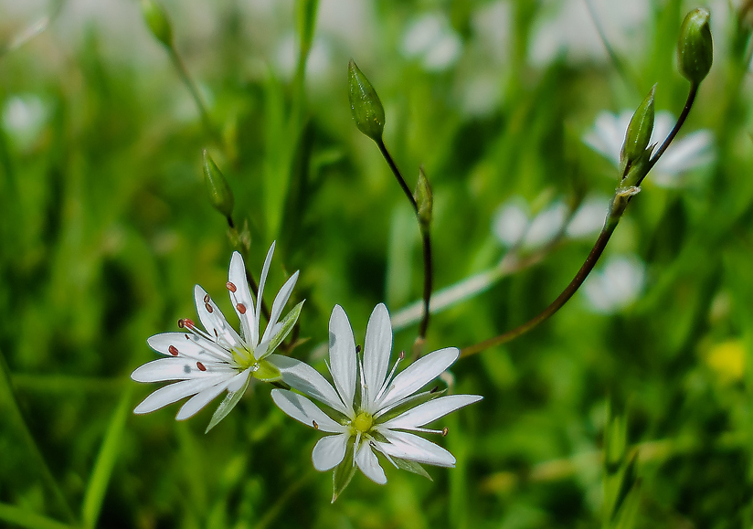Если листочки на снимке снизу-слева принадлежат этим же растениям, то на снимке скорее всего звездчатка длиннолистная - Stellaria longifolia .