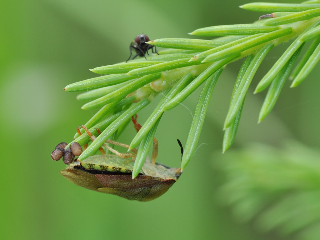 Щитника определил как Carpocoris pudicus, но могу и ошибаться.