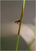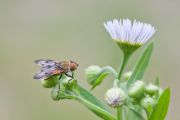 Пчёлы отличные химики. Им ведь ещё надо провести реакцию разложения сложных сахаров на глюкозу и фруктозу. Поэтому они не просто впрыскивают свежий нектар в первую попавшуюся соту а выбирают уже с мёдом, где идёт реакция и вот вот остановится из за большой концентрации моносахаров, тем самым разжижая уже почти готовый мёд и восстанавливая реакцию до полного разложения сахарозы. Кроме того, они в это время очень сильно вентилируют улей так, что он гудит как трансформатор. Но им надо запасать кондиционные корма на зиму. А мушке нет. Может ей нужно кормить потомство, поэтому она и выдувает капельку - за счет большего объёма идет активное испарение воды.