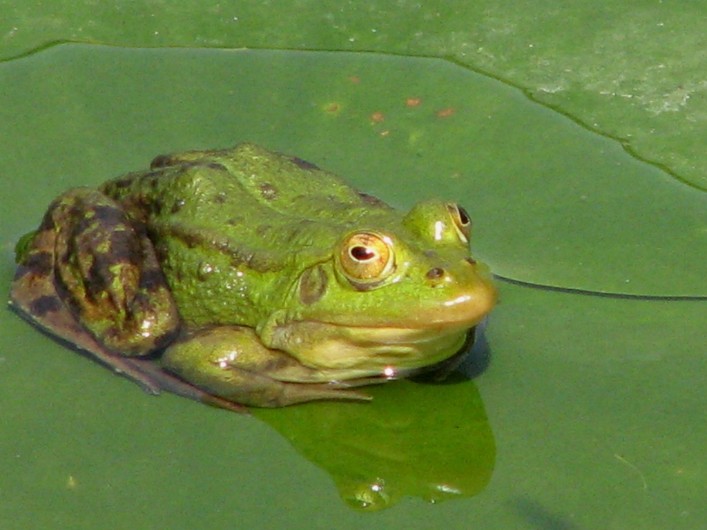 Посещая ботанический сад, не могла обойти вниманием пруд. Среди множества лягушек, расположившихся на его берегу, в воде и на листьях кубышки, мне особенно понравилась эта толстая и довольная жизнью особа. Мне она показалась похожей на мадам Брошкину - при пристальном внимательном можно рассмотреть на ее мощной груди брошь, а на корявых пальчиках - кольца с бриллиантами!