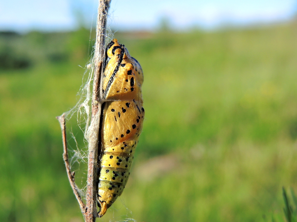 На снимках куколка боярышницы (Aporia crataegi).