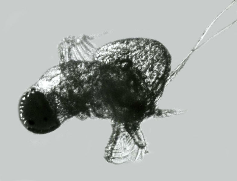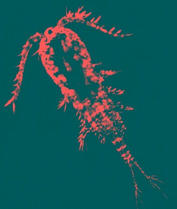 Этот рачок будет чуть покрупнее (самка до 2,32 мм, самец до 1,60 мм), такие же прозрачные, иногда серенькие, обитают также на мелководьях прибрежной части озер и даже в лужах. Рачок, практически, тоже наш, т.е. Северный. Их бесцветность под микроскопом настолько надоела, что решил «похулиганить» и с помощью фотошопа сделать его вот таким огненным. Если учитывать, что все они снимаются в движении, то резкость снимка может быть и не всегда…..форма, главное – форма, конечно, в случае сравнения полифемуса и этого циклопа. А самих циклопов сравнивать бессмысленно, ибо их, в отличии от одинокого полифемуса, бесчисленное количество видов (пара длинных антенн, округлая, чуть продолговатая головогрудь, длинное брюшко - обдомен и вилка (фурка) со щетинками на концах, в которых и «зарыта вся собака» определения). В данном случае, по-видимому, этот рачок из рода циклопов (Cyclops strenuus Fisch.), отр. (п/отр) Веслоногие раки (COPEPODA) ……..понятно, чем они гребут, сем. Циклопы (Cyclopedae). В отличие от ветвистоусых, большинство веслоногих – хищники, яйца свои развешивают в мешках по бокам тела. По отношению к загрязнению, они более устойчивы, чем ветвистоусые и являются другой ступенькой в системе индикации загрязнения вод.