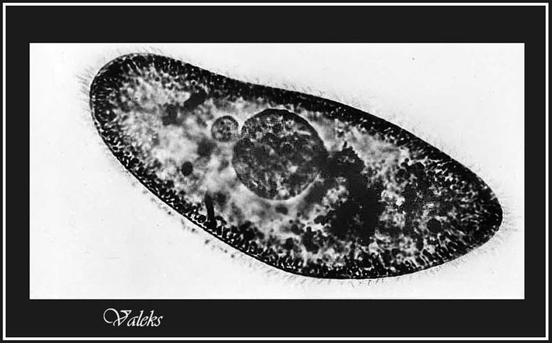 Почему от «микро к макро и обратно»? Да потому, что есть еще супермикрофотография, осуществляемая с помощью электронных микроскопов. К нашей макрофотогрфии это имеет малое отношение, хотя раздел микрофотографии есть, и желающие в нем отметиться тоже имеются. Встреченный мною в институте ЭМ-1 в70-х годах представлял громоздкое зрелище (не знаю уж, как сейчас), типа огромного фотоувеличителя размером от поверхности стола и до потолка. Отличие электронного микроскопа это замена светового потока пучком электронов, увеличение его - 10 в 6-й степени раз с энерг.200В - 4000КВ и более. Эти микроскопы двух типов:- растровый (поверхностный) и сканирующий (объемный). Простейшими организмами для «Атласа индикаторных организмов» я в то время не занимался, но вот эту парамецию туфельку я себе на память оставил. Снималась она в полуобездвиженном состоянии (капля глицерина), но при этом все у нее внутри и снаружи двигалось. Подробное строение парамеции можно прочитать в любом серьезном учебнике зоологии. На этом же снимке можно рассмотреть тут и там плавающие внутри вакуоли, переваривающие пищу (черные кружочки), круглый ( по центру) макронуклеус с ядерным аппаратом внутри, обеспечивающий обмен веществ, движение и половое размножение. Справа от макронуклеуса – бесформенная глотка, заглатывающая в себя бактериальную пищу и выбрасывающая наружу сформированные пищеварительные вакуоли, которые плавают внутри тела в эндоплазме. Но есть еще эктоплазма, наружная оболочка тела парамеции. Эктоплазма имеет сложное строение, ее самый прочный элемент – тонкая эластичная оболочка (пелликула) хорошо видна снизу на снимке. Прочность ее повышается за счет шестигранников, в каждом из которых расположена ресничка. Реснички, в основном, выполняют двигательную функцию, но и функцию направления внутрь пищи снаружи (глотку). Другие реснички, по-видимому, играют роль ядовитых жгутиков и парализуют добычу. Вся эта начальная система органелл (не органов) в дальнейшем совершенствуется и развивается в системе простейших организмов (других видов), и не только простейших. Систематически туфелька (Paramaecium caudatum)относится к отряду равноресничных (Holotrisha), п/к. Ресничные инфузории (Ciliata), кл. Инфузории (Infusoria).