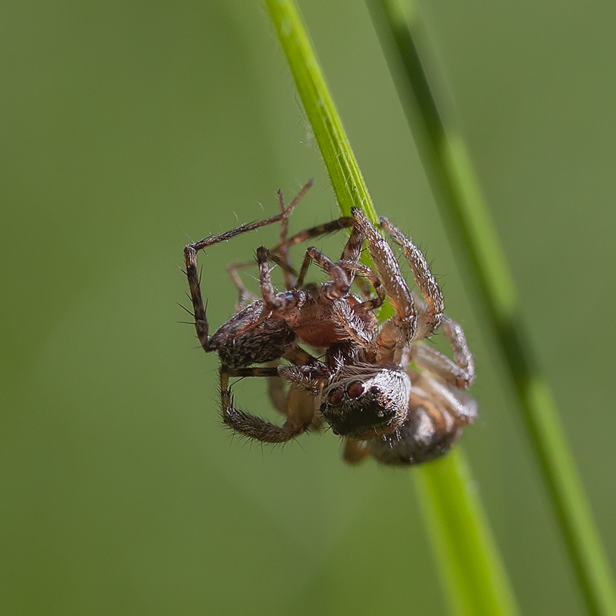 У меня пока что смутное, но подозрение, что жертва - самочка другого паука... К сожалению, очень плохо видно её переднюю часть, но на первом снимке, похоже, тонкая женская педипальпа торчит , и ноги подозрительно длинные, стройные и шипастые.
