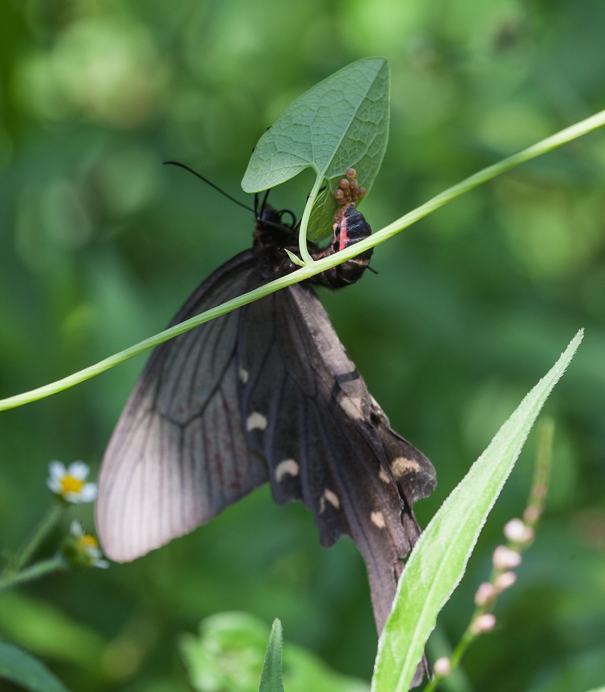 Растение-конечно кирказон (Кирказон маньчжурский (Aristolochia manshuriensis)), но самое интересное, на мой взгляд, что яйца откладывались на самые молодые побеги. Потом нашел еще несколько кладок и все на молодых побегах. Может заботятся о еще слабеньких "зубках" молодежи?