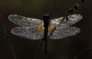 Помню долго сокрушался (глядя на прекрасные фотографии летящих стрекоз моих коллег), летящие мухи есть, бабочки есть, а вот даже самых крупных стрекоз - коромысел у меня нет......Но вот покопался опять в своем архиве и нашел летящее коромысло. Вспомнил, что снимал ее уже вечером над прудиком, где кардинские дамы белье полощут. Летала стрекоза маятникообразно, в одном ракурсе и почти против солнца. Даже снимки не стал смотреть, думал, ничего не выйдет и сбросил несколько снимков с нее в архив. В Косякове коромысло вообще редкость, речушка в тени и все. Кажется можно бы и закончить разговор о ее съемке , но мысли повели меня куда-то в другую сторону...... Здесь стрекоза зашла на меня с другого (единственного) ракурса и как бы пикировала на меня (на дисплее естественно). И представилось мне ее историческое прошлое еще в Палеозойскую эру (85 млн. лет назад). Тогда они летали среди папоротниковых и хвощовых лесов, и размеры их в размахе крыльев достигали почти метра (70 и более см). Да и вообще, размеры палеозойских насекомых были огромны. У первичных поденок, веснянок (они появились раньше первичных стрекоз) эти размеры были редко менее 50 см. Прикрыл я глаза, заглянул в эту историю и "жутковато" мне стало, как представил, что эта хищная махина с челюстями в кулак, ринулась на меня с высоты. Таким я показался себе маленьким, ничтожным на поляне папоротникового леса, что сжался весь в комочек......что и попытался отразить на фотографии своей мелкой,сжатой подписью под коромыслом. А не было бы этой подписи, ну стрекоза и стрекоза, мало ли их у нас в галерее....Похоже, это тоже коромысло синее (Aeschna cyanea Mull.), отр. Ложносетчатокрылые или стрекозы (ODONATA), сем. Коромысло (Aeschnidae). Можно посмотреть ее и более крупную в моем альбоме Стрекозы.