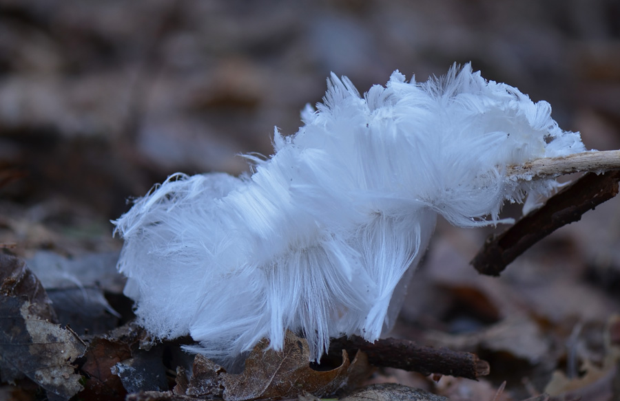 В начале ноября, при падении температуры до минусовой, можно найти весьма интересный и загадочный объект «Снежные волосы», в западной литературе «Snow hair». Объект представляет из себя тончайшие ледяные нити в пучках, которые могут быть как прямыми так и вьющимися по типу кудрей, иногда весьма длинные, до 8-10 сантиметров, растущие на каком либо субстрате. К слову сказать, объект этот весьма редок, и найти его большая удача!