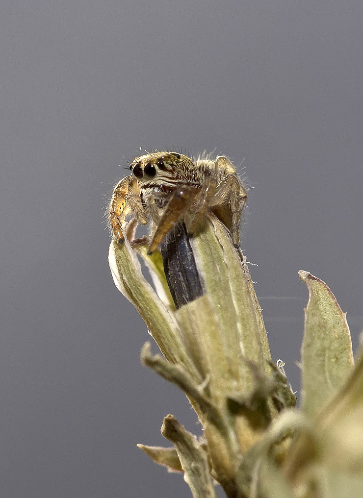 По осени несколько пауков скакунчиков забегали в гости на третий этаж... парочка точно поселилась на пальме (я их туда пересаживал). Закончилась осень, пальма переехала с лоджии в зал на ПМЖ. Сегодня один из паучков... откуда только вполз... бегал по потолку. Был пойман, отфотографирован и... покуда сбарсывал фото на комп - сбежал...