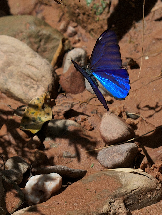 Это другой вид Морфо, возможно Morpho didius с ярко-голубыми крыльями. Снять эту бабочку в покое с раскрытыми крыльями так и не удалось. Они часто подлетали к поверхности воды и затем, как будто увидев в ней отражение другой бабочки, бросались на "зеркало", ударялись о его поверхность и тут же взлетали.