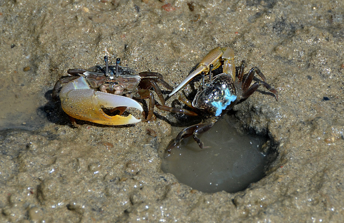 Во время отлива, а вода уходит метров на 300 от берега, обнажается болотистая почва. Я рискнул залезть в эту чачу, и был поражен количеству крабов вылезших из своих норок. Их было сотни тысяч, может и миллион. Количество поражало! Они постоянно дрались между собой, ловко оперируя своими большими клешнями. У всех было по одной клешне. По этому болоту сильно не побегаешь, а они близко к себе не подпускают. Разбегаются как тараканы...