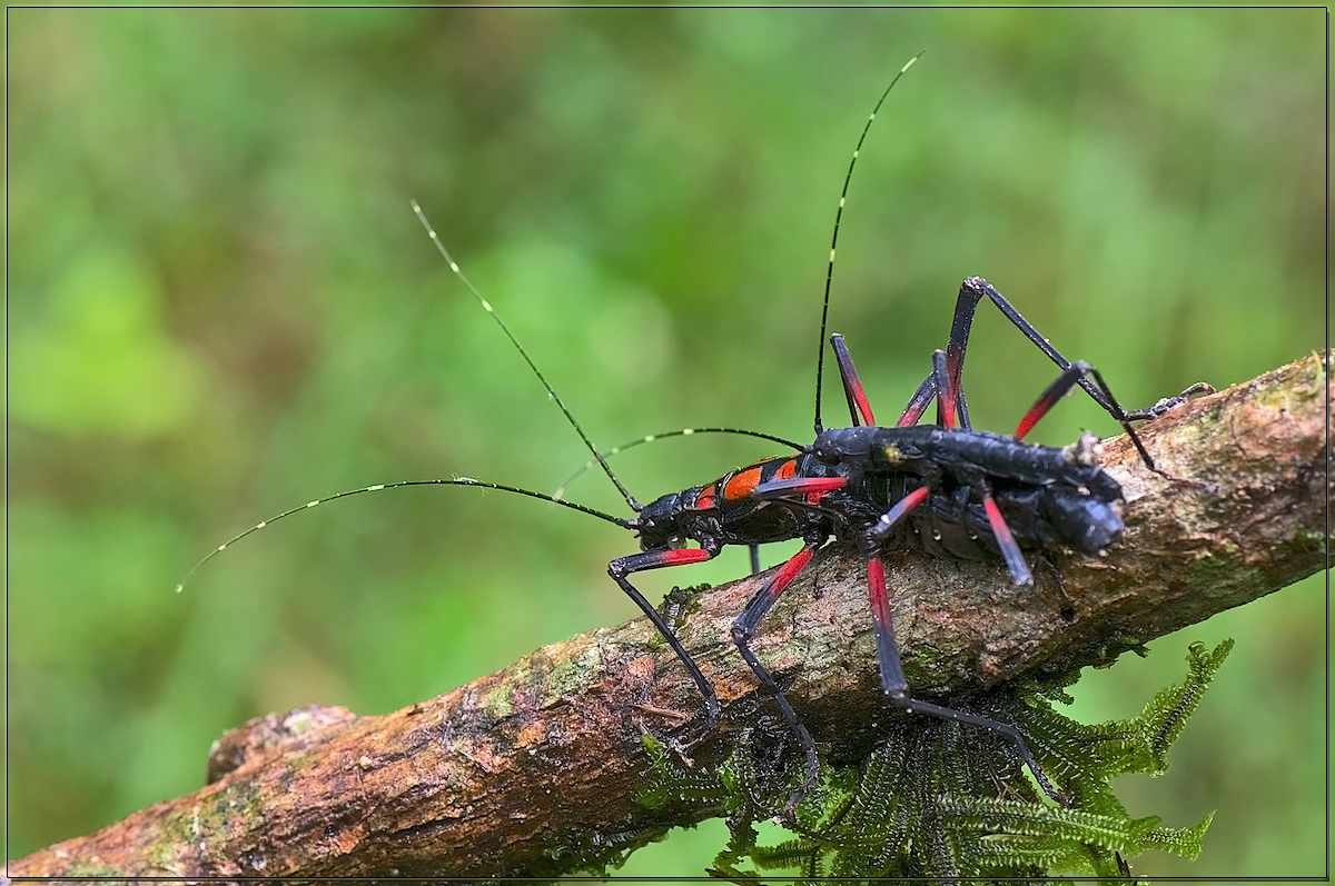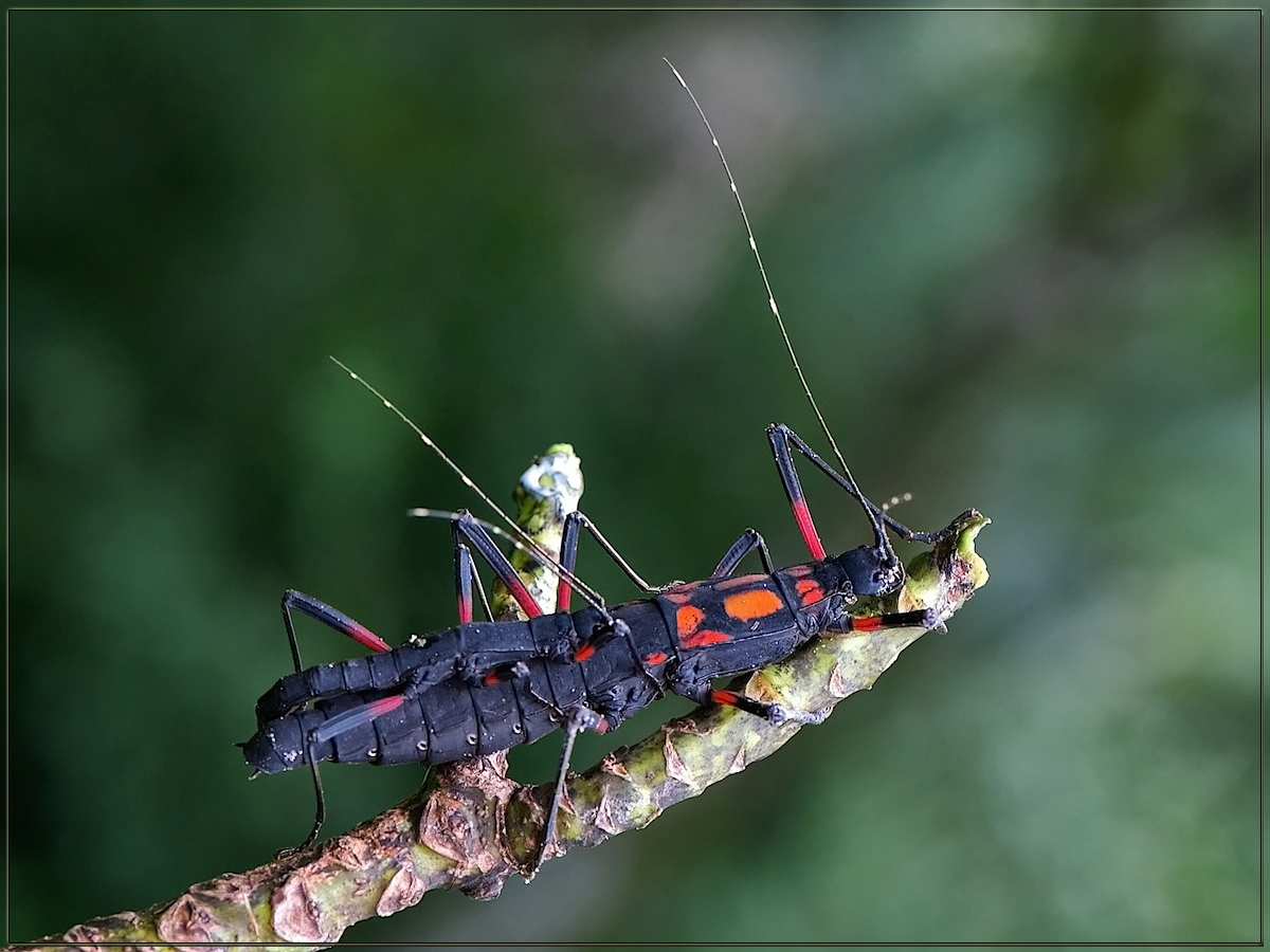 Обычно палочники имеют покровительственную окраску и их трудно заметить среди растительности. Эти же, наоборот, "одеты" вызывающе ярко, очевидно, что бояться им не чего, наверняка ядовиты.